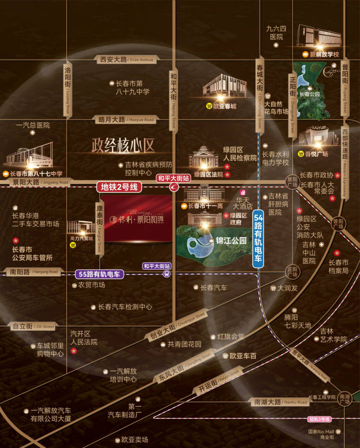 项目择址景阳大路与和平大街交会处,位列城市核心板块,约100米即达地铁2号线路有轨电车,西部快速路无缝连接,交通畅达城市各重点商圈,尽享全城配套。