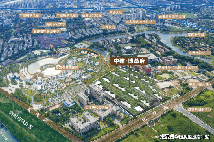 在寸土寸金的长沙内五区,大面积的公园与河流,是最奢侈的配置。博萃府的占位堪称奢侈:项目西侧紧邻840亩东湖生态公园,南向则直面一线浏阳河风光带。这种“一河一湖双公园”的生态格局,在长沙主城区的新房项目中,几乎是孤例。这不仅是窗外的风景,更是每日可享的健康资产。