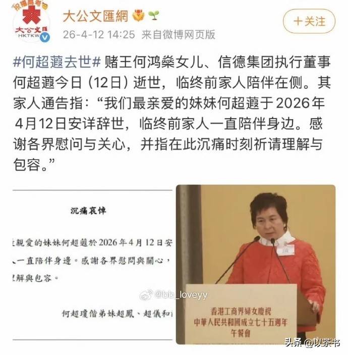 2026年4月12日,香港顶级富豪的“御用医院”养和医院里传出的一个死讯,赌王二太蓝琼缨的三女儿何超蕸,因为乳腺癌复发,安详离世,把人生的永远定格在了60岁。