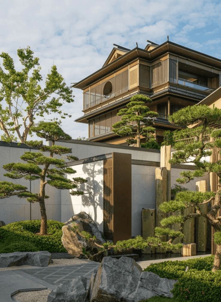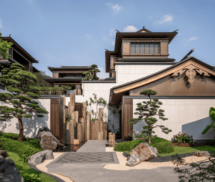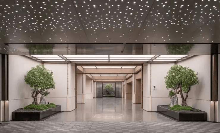 从整个动线布局来看,设计采用了经典的“巷门-院门-宅门”三进制院落格局,以江南院落再现东方传统礼序。从园区巷门开始层层递进,到一户一府的院门,再至入户宅门,表现出大户人家的归家气场,带来一种尊贵秩序的仪式感,也将中式生活的画卷次第展开。