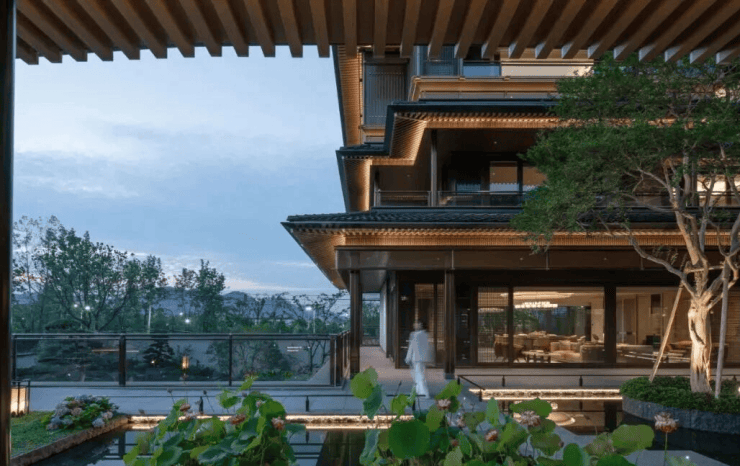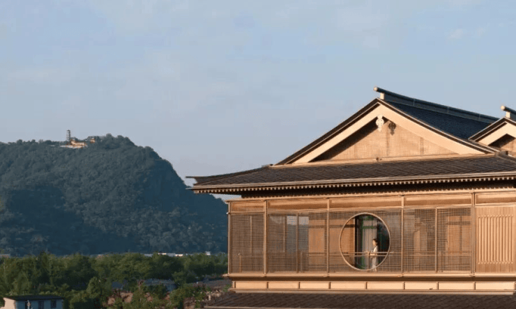 屋面曲线延续了宋代举折构造形式,整体更为轻薄现代。整个建筑立面也不再是厚重的墙体结构,大块面通透落地玻璃窗被木色金属格栅包裹,有韵律地竖向划分成屏风式条块,这使得建筑形体的表达更为简洁,整体呈现一种更为简约的轻盈感。