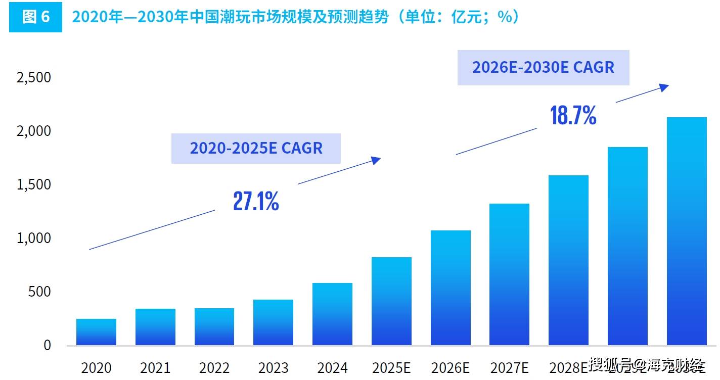 从全球来看,潮玩正持续从小众圈层走向大众市场。据国际知名会计师事务所毕马威2026年4月发布的调研报告《潮玩行业全景洞察与趋势展望》,2024年全球潮玩市场规模已达418亿美元,约合人民币2857.57亿元,同比增长14.2%,预计2025年将达520亿美元,约合人民币3554.88亿元;中国潮玩市场规模增速更快,2024年中国潮玩市场规模已达587亿元,预计2025年将达825亿元,2020-2025年CAGR(年均复合增长率)为27.1%,高于全球平均水平,预计2026-2030年CAGR为18.7% 。