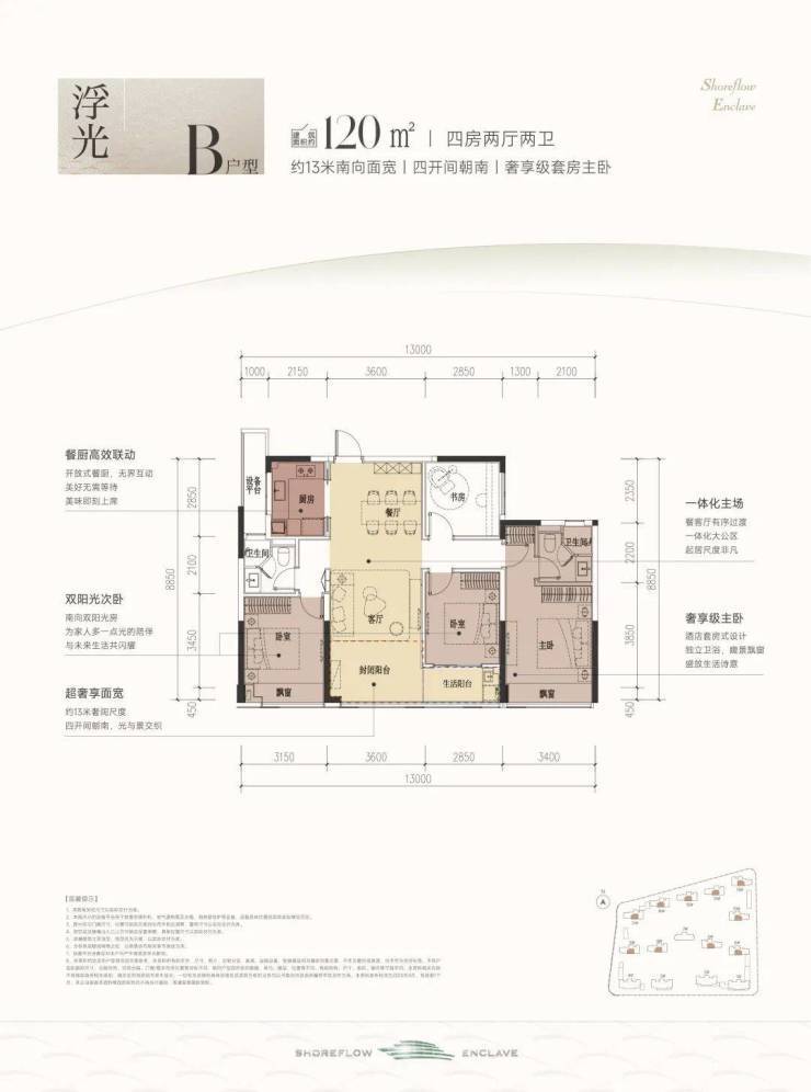 南向面宽约13米,双联阳台+双飘窗设计,视野和采光优秀;套房主卧、双阳光次卧,颇有大平层的气势。