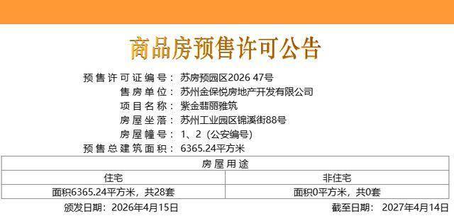 首先,看园区新房市场的整体供求情况。2026年3月,苏州工业园区新房成交面积为6.66万平方米,成交套数为347套,成交 均价为41459元/平方米。相比之下,紫金翡丽甲第的备案均价58021元/平方米,明显高于区域平均水平,这与其高端定位相 符。