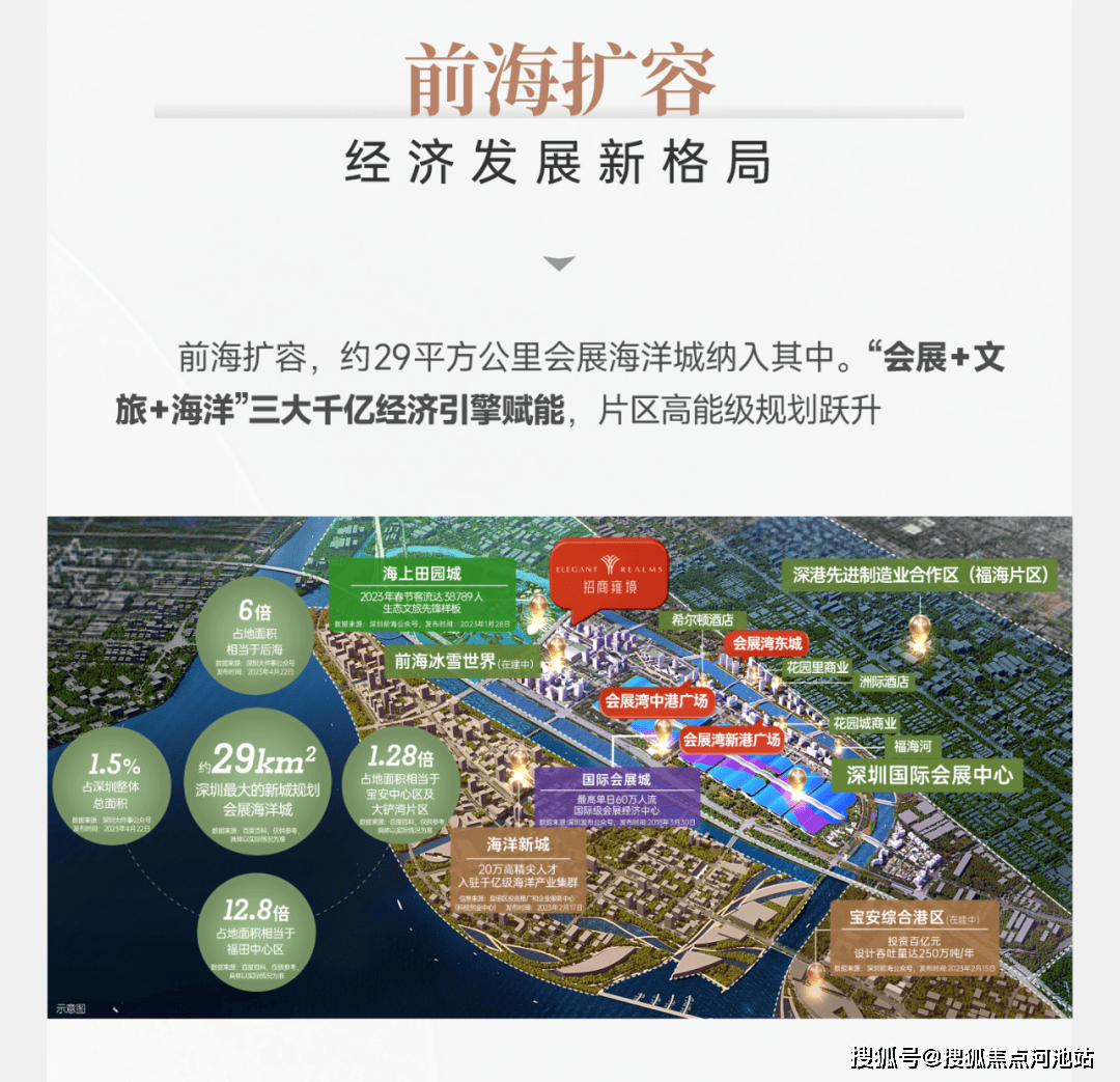 项目位于大前海扩容区,是深圳最后一块填海用地;周边还有国际会展中心(已开业,直接带动相关产业收入约1350亿元)+海洋新城(预计2035年建成,预计建成后产值规模达7000亿元)+文旅(华发冰雪世界+海上田园4A景区+金蚝小镇),整个片区目前都是在大规模建设初期,未来发展预期较大。