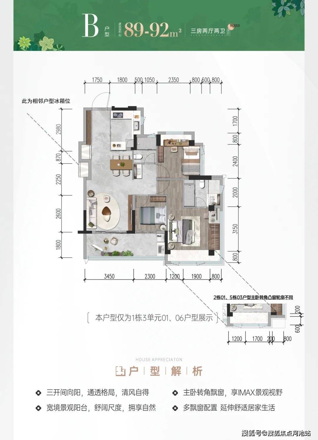 这个是主力户型,主要分布于1栋3单元的01/02和06/07户型,其中01/02是西南朝向看华发冰雪世界;06/07是东南朝向看小区花园。