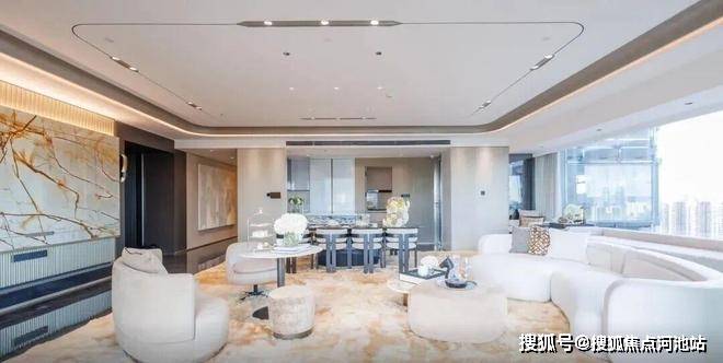 大平层约3.25米的层高,在顶豪圈里都是很罕见的高阔配置。每一户都有一个双面观景采光的一体化餐客厅。环幕视野引入室外景观,成为少数人才能拥有的风光背景墙。